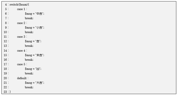 case 4: … 変数$numの値が4なら、変数$msgに「末吉」を代入してswitch文を抜けます。