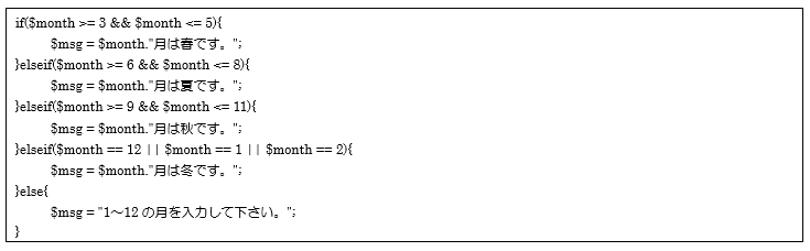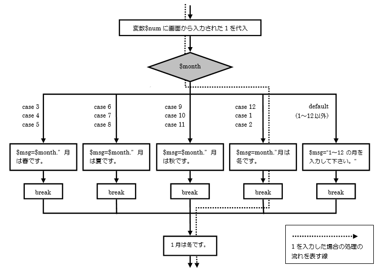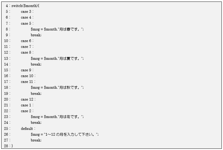 defaultの場合:変数$msgに「1~12の月を入力して下さい。」を代入しswitch文を抜けます。