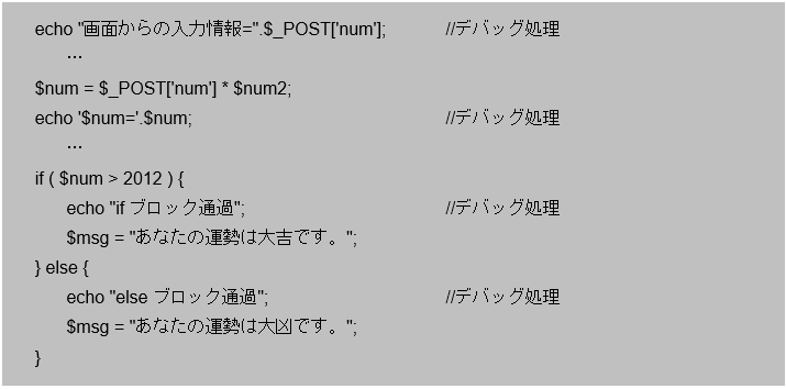 情報を出力してデバッグを行う方法は、本来の処理とは関係のない処理を追加しているため、そのままではデバッグのための処理がバグになってしまいます。デバッグが完了したら「必ず削除」するようにして下さい。