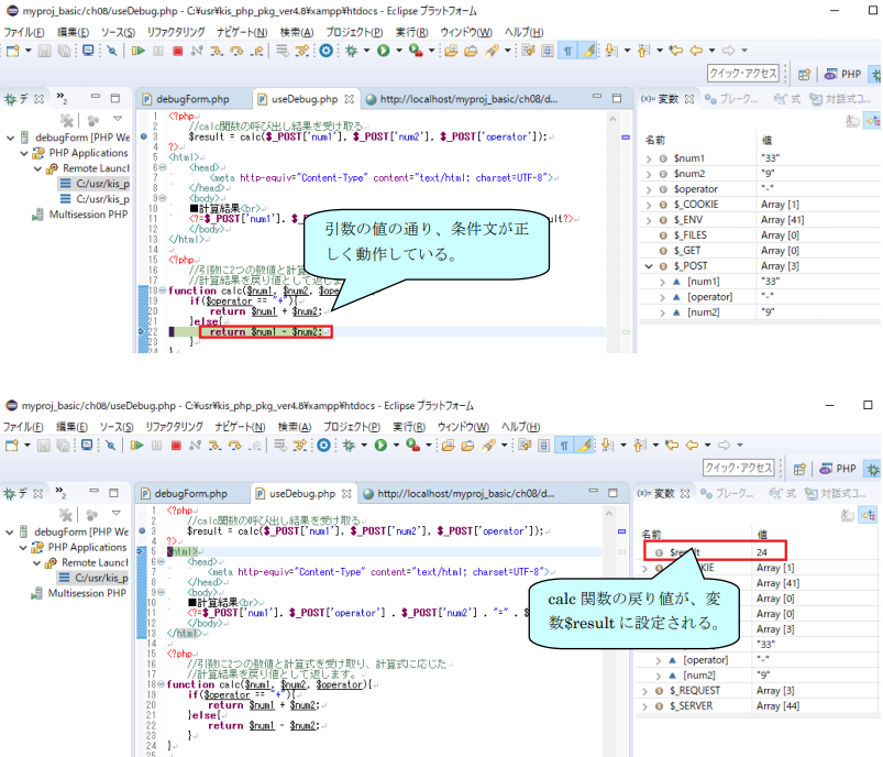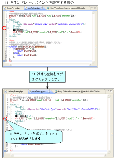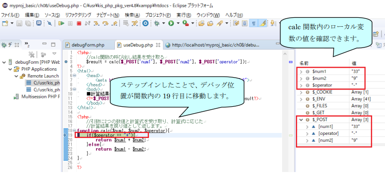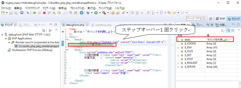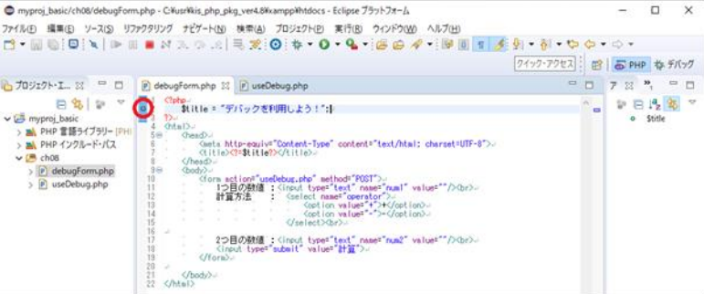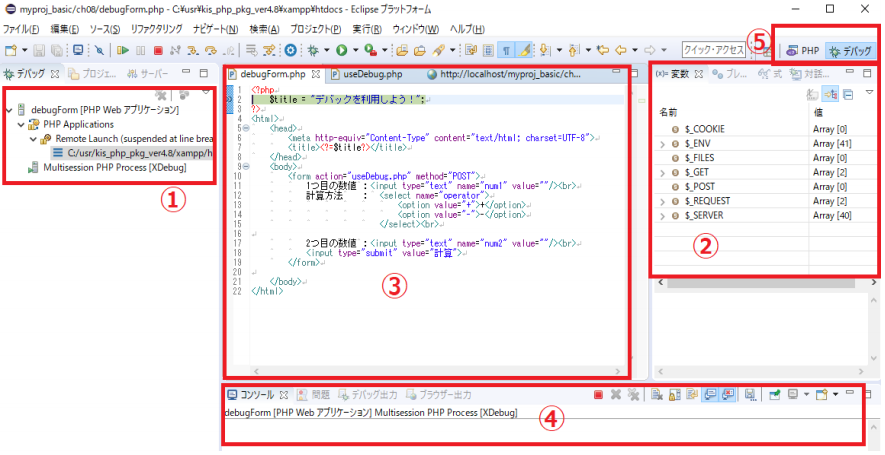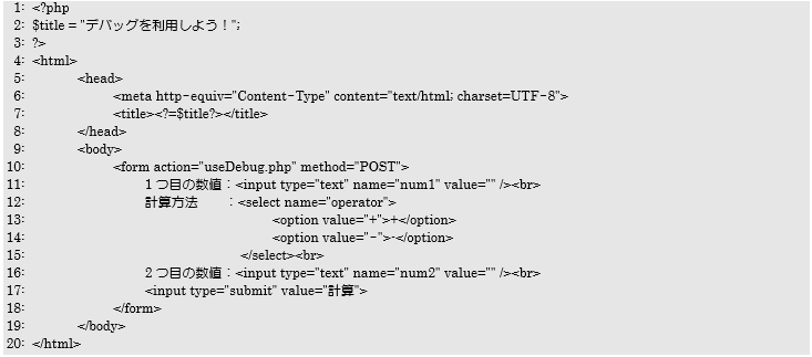 タブ)のフォームからデータを入力して送信(計算ボタン)を行えば、遷移先である useDebug.php の先頭行からデバッグ処理が引き続き行われるようになっているのです。