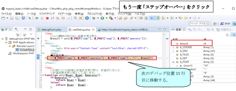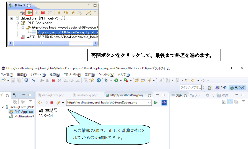 では、どのようにすればいいのか、その方法は簡単です。これまでの Step7 までの手順で debugForm.phpのデバッグ処理は終わってしまいましたが、その実行処理で開かれた実行画面(ソースコードビュー内の http://…
