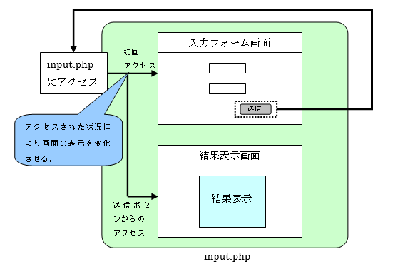 初めてWebページを表示させた場合は「入力フォーム画面」、入力フォーム画面から送信ボタンが押されてWebページを表示させた場合は「結果表示画面」を、条件分岐文を使って表示の切り替えを行います。