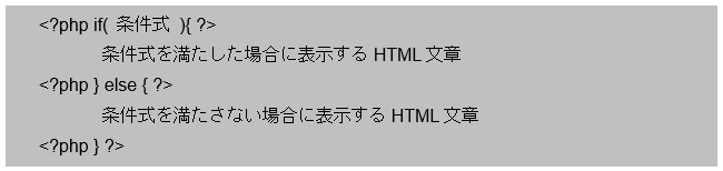 これまで学習してきたPHP構文のif文を以下の書式のように区切っていきます。書式ではif-else文になっていますが、条件式はPHP内で利用したように条件の数に応じて設定できます。
