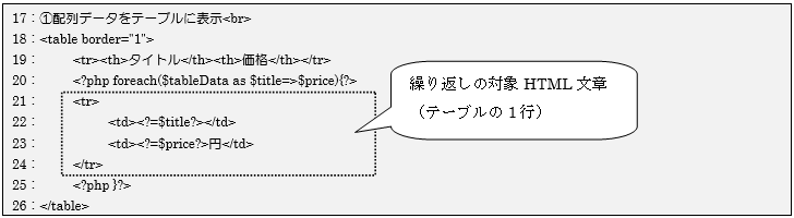 20行目と25行目で繰り返し文を記述して、配列変数$tableDataのデータ数だけその間に記述された内容を繰り返し表示するようになります。