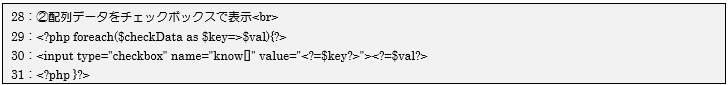チェックボックスの場合は29行目と31行目の繰り返し処理の間に、<input>タグを記述すればいいだけになり、1つ目の処理と同じように、配列変数$checkDataの数分だけチェックボックスを表示します。その際にはname属性は同じ名前know[](遷移先に配列データとして送信できる)、value属性に配列の添え字数値キー、画面に表示する項目文字列に配列の格納データを設定しています。