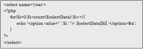 35行目ではfor文とcount関数を組み合わせて、配列変数$selectDataの数分だけ<option>タグを表示しています。その際にはvalue属性にはカウント変数$i、表示項目として配列の格納データを設定しています。