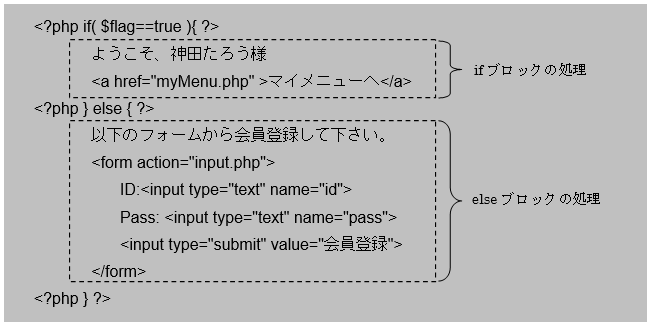 上記の凡例では、変数$flagがtrueなら「ようこそ、神田たろう様・・・」のHTML文章が表示され、そうでない場合は「以下のフォームから・・・」のHTML文章が表示されます。このようにHTML文章でも条件分岐文を利用すれば、条件式の結果に応じて画面に表示するHTML文章を変化させることができるのです。