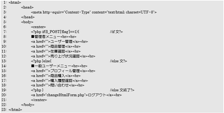 7行目のif文は、遷移元からのPOSTデータが「1(管理者を選択)」であるかを判定しています。ここで一旦PHPモードを終了させているのがポイントになり、13行目は再びPHPモードで、7行目のif文の続きのelseブロックを記述して再度PHPモードを終了させます。最後に19行目でも再びPHPモードで、13行目のeles文を閉じるための処理を記述してPHPモードを終了させます。