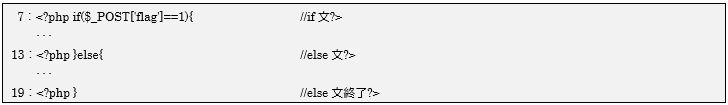 このように条件文をそのブロック毎にPHPモードで区切ることで、7行目の条件式を満たせば7~13行の間に記述されたHTML文章が表示され、そうでない場合は13~19行の間に記述されたHTML文章が表示される仕組みになります。