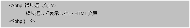 前項では条件分岐文をPHPモードで区切って処理することで、その間に記述した内容を条件を満たした場合の処理にすることができました。繰り返し文も同じようにPHPモードで区切ることで、その間に記述したHTML文章を繰り返し対象にすることができます。