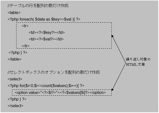 また、凡例ではテーブルの行タグとセレクトボックスのオプションタグしか紹介していませんが、チェックボックスを複数表示したり、テーブル全体を表示したりもできます。繰り返し文の間に記述できるタグは、HTML文章の全てが対象になることを覚えておいて下さい。