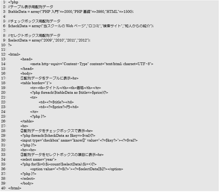1~10行目の間でarray関数を利用して、各配列変数に表示用データを設定しています。