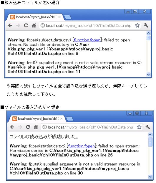 例えば10.3.2項で作成した、「fileInOutData.php」を実行する時に、「subject_data.csv」が無い場合や、または「statistics.txt」が読み取り専用になっている場合はエラーになってしまいます。