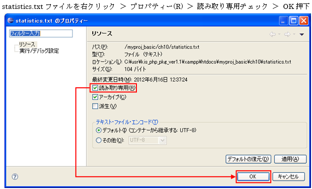 を開き、読み取り専用にチェックを入れます。