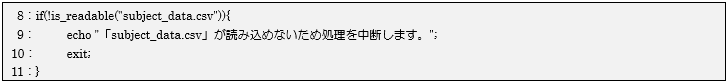 8~11行目の処理で読み込みファイルがあるかの確認を行っています。is_readable関数はファイルがありかつ読み込める場合に戻り値「true」を返すので、「!」で結果を反転させます。そうすることで8行目のif文では読み込むファイルが無い場合にifブロック内の処理を行うことになります。