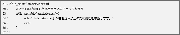 ファイルが存在すればis_writable関数を使って書き込みが可能なのか確認します。この関数は書き込める場合戻り値「true」を返すため、「!」で結果を反転させて、33行目のif文で書き込めない場合、ifブロック内の処理を行うようにしています。