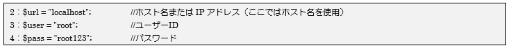 第3引数のパスワードには第2引数のユーザーIDの「パスワード」を設定します。