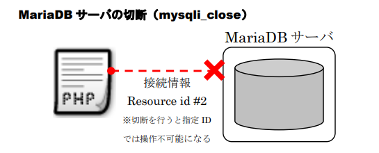 • MariaDBサーバ接続の切断:mysqli_close関数