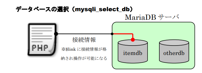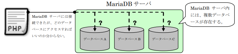 PHPからデータベースを利用するには、必ずMariaDBサーバへ接続する必要があります。 そして、MariaDBに接続してから、利用するデータベースの選択して初めてデータの検索(取得)や更新が行えるようになります。