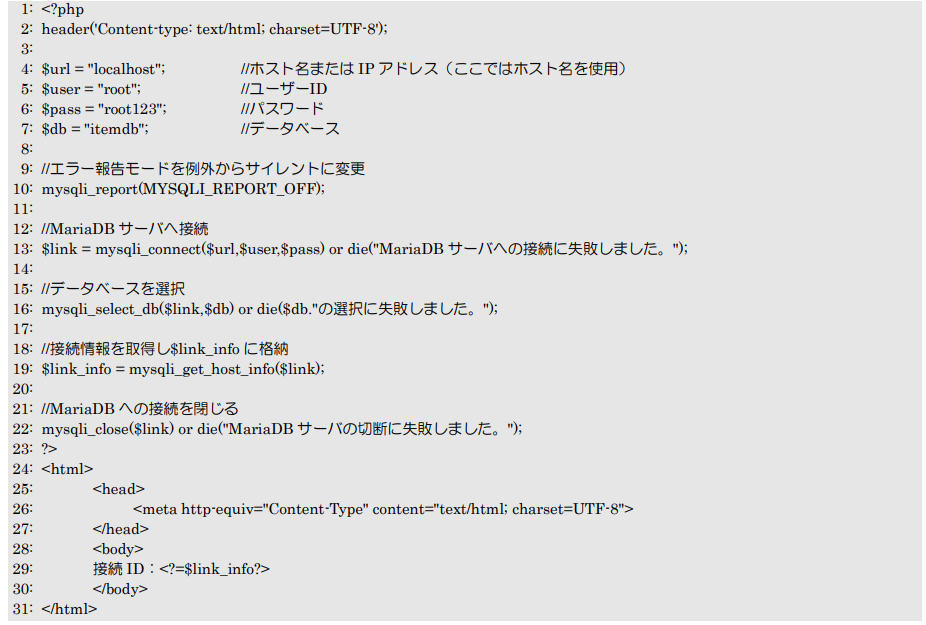 PHPからMariaDBサーバへ接続して切断し、接続情報を画面に表示して確認します。