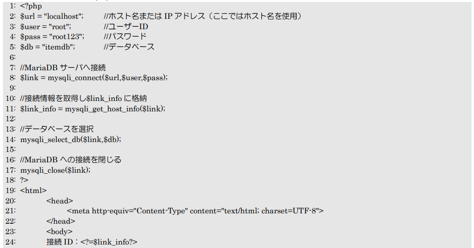 7行目でmysqli_connect関数の引数に各情報を設定して、MariaDBサーバへ接続しています。変数$linkに代入される戻り値が「接続情報」になります。