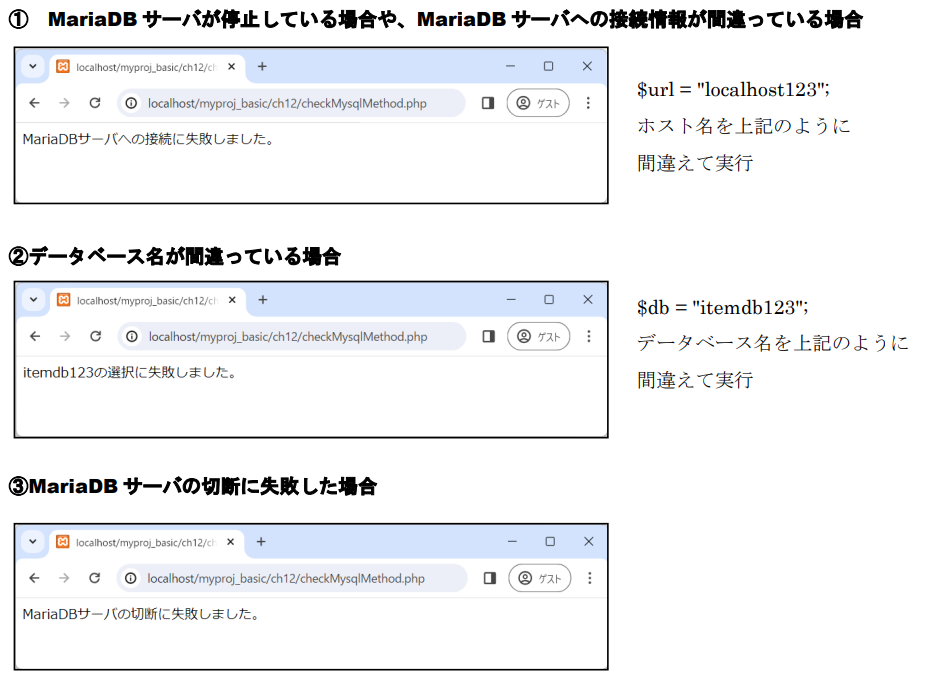 アクセスURL:http://localhost/myproj_basic/ch12/checkMariaDBMethod.php
