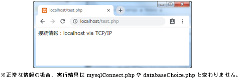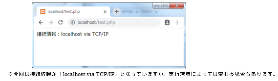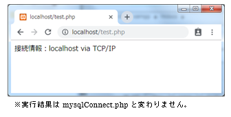 18行目では接続情報(localhost via TCP/IP)を画面に表示しています。11行目でこのサーバへ接続を切断しDB自体は使用不可能になっていますが、9行目で接続情報のテキストを変数$link_infoに代入したのでそのまま表示できます。