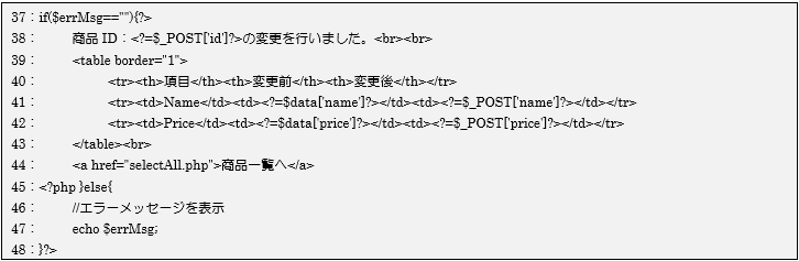 エラーメッセージが空の場合は正しく更新処理が行われていると判断できるため、変更前と変更後のデータを画面に表示します。逆に更新処理が行われていない場合は、エラーメッセージを画面に表示します。