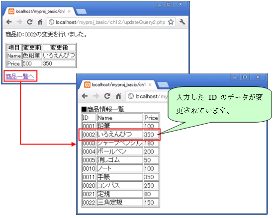 「updateQuery2.php」の画面に12.5.2で作成した「selectAll.php」へのリンクを用意して確認します。