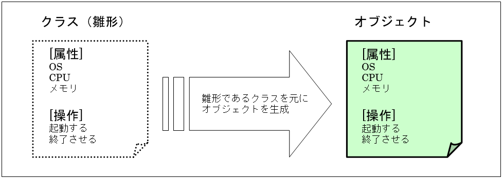 逆に言えば、オブジェクトに持たせたい属性や操作は、クラスというプログラムの形で記述すれば良いことになります。