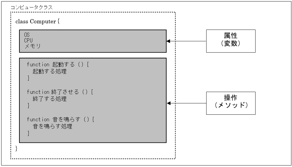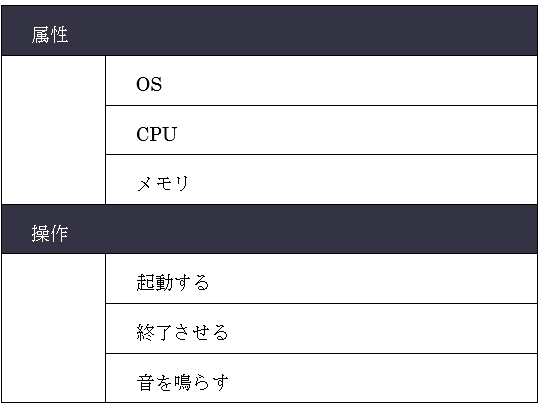 これらの属性と操作をクラスに設定します。属性は変数、操作はメソッドで記述しますので、上記の表のような属性と操作を持つようなクラスを作成する際には「OS」、「CPU」、「メモリ」を何らかのデータ型の変数として記述し、「起動」、「終了」、「音を鳴らす」という操作をメソッドとして記述する形になります。