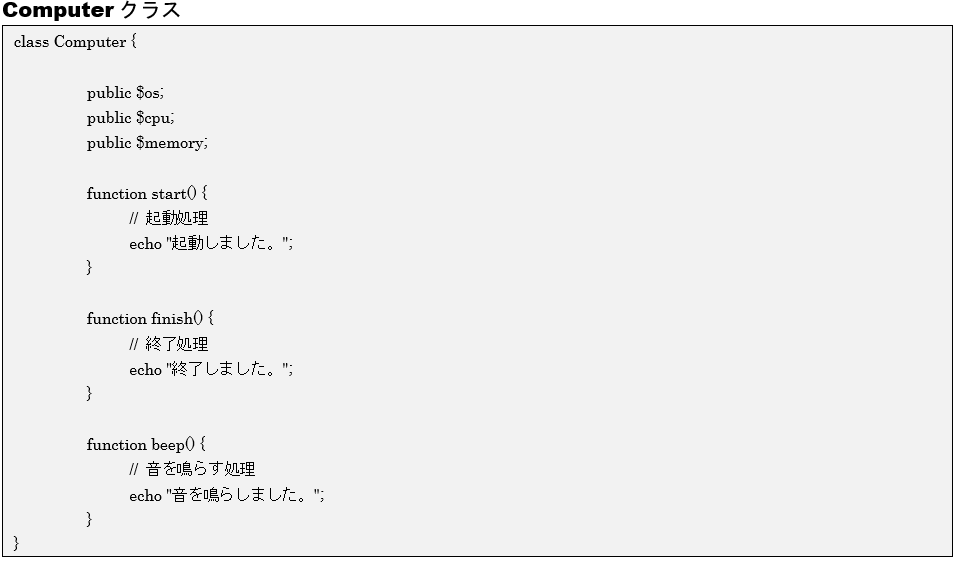 このComputerクラスはフィールド変数を「$os、$cpu、$memory」の3つ定義しています。これらの変数の左側に書かれてるpublicはアクセス修飾子です。詳細は3章で解説するので、今はそういうものを記述しておくのだと覚えてください。
