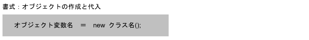 • オブジェクト作成方法は「new演算子」を用いて、雛形であるクラスからオブジェクトを生成する。