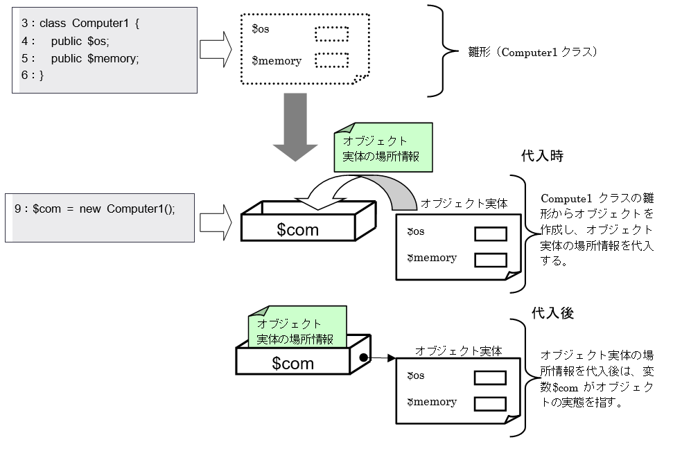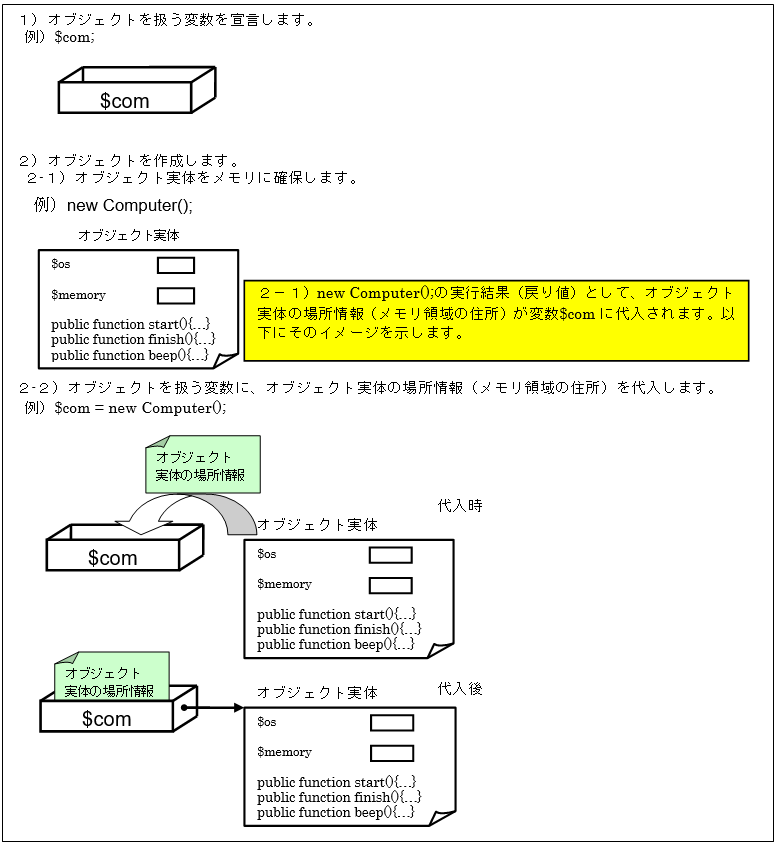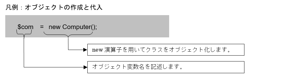 上記の例では、「newを使った結果を変数$comに代入する」という処理を行っています。この代入処理を行うと変数$comを使って、new演算子で作成したComputerクラスのオブジェクトを扱うことができるようになります。このことを、変数$comはComputerクラスのオブジェクトをさすといいます。