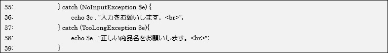 [html] <?php // 商品名が未入力の時の例外 class NoInputException extends Exception{ function __toString(){ return “商品名が入力されていません。<br>”; } } // 商品名が長すぎる時の例外 class TooLongException extends Exception{ function __toString(){ return “商品名が長すぎます。<br>”; } } ?> <html> <head> <meta http-equiv=”Content-Type” content=”text/html; charset=UTF-8″> <title>2つのcatchブロックを使う</title> </head> <body> <form action=”twoException.php” method=”post”> <input type=”text” name=”product” value=”<?php echo $_POST[“product”];?>” /> <input type=”submit” value=”送信” /> </form> <?php try { if(isset($_POST[“product”])){ if($_POST[“product”] == “”){ throw new NoInputException(); } elseif (mb_strlen($_POST[“product”]) > 10){ throw new TooLongException(); } echo “「{$_POST[“product”]}」をお買い上げいただきました。<br>”; } } catch (NoInputException $e) { echo $e . “入力をお願いします。<br>”; } catch (TooLongException $e){ echo $e . “正しい商品名をお願いします。<br>”; } echo “テキストボックスに購入する商品名を入力してください。<br>”; ?> </body> </html> [/html]