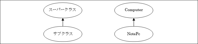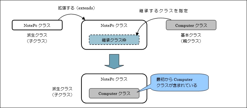 例えば前項で例にあげた「ノートパソコン」を作成したい場合、新しく「NotePcクラス」を作成する際にクラスを拡張(extends)して、既存の「Computerクラス」の機能を受け継ぐよう指定します。その結果、「Computerクラスの機能を継承したNotePcクラス」が作られます。