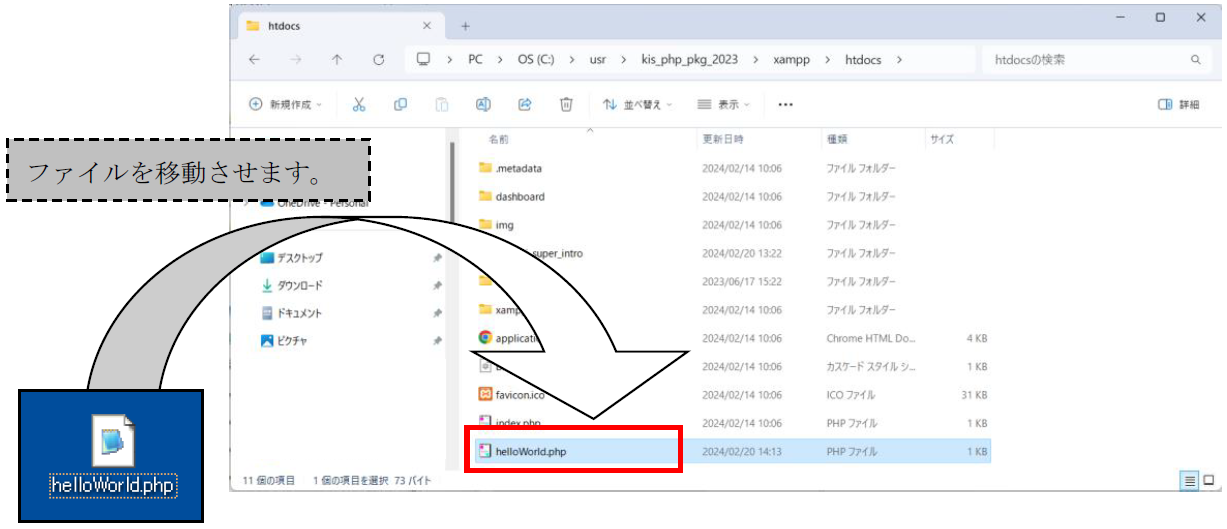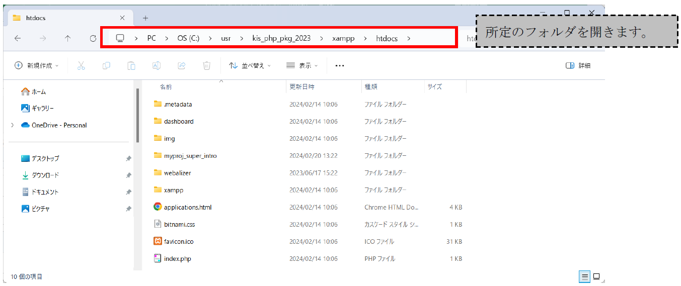 本テキスト通りに環境構築を行った場合は、「C:\usr\kis_php_pkg_2023\\xampp\htdocs」がApacheが