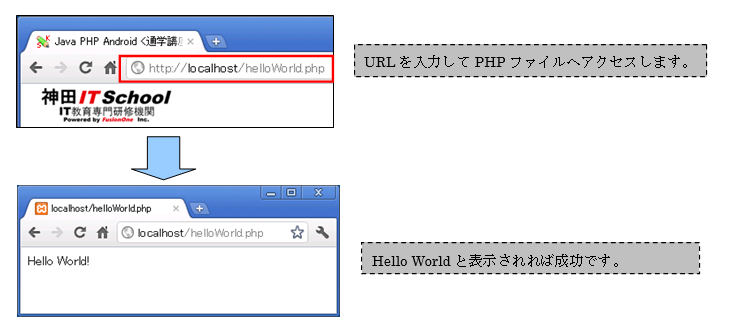 ①Webブラウザを開き下記URLを入力して、PHPプログラムを確認します。