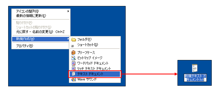 デスクトップを右クリック > 新規作成 > テキストドキュメント 選択 を行うと、デスクトップ上に