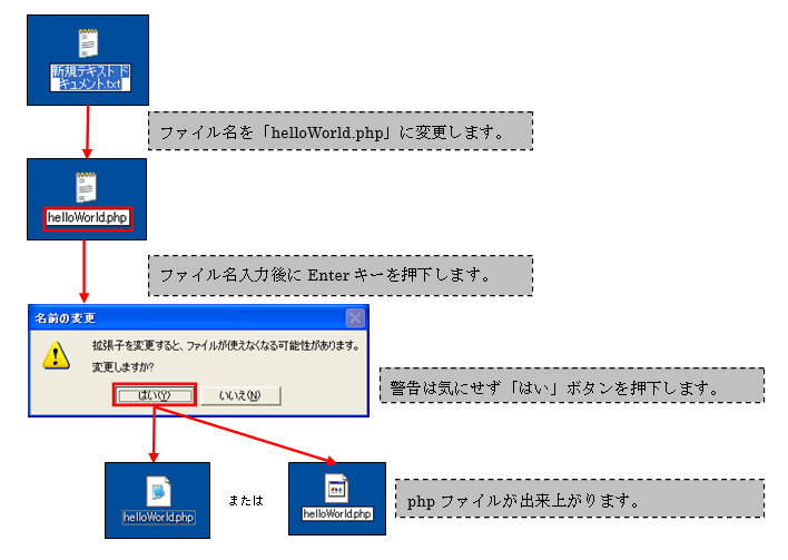 ファイル名をhelloWorld.phpと入力 > Enterキーを押下 > 警告は気にせず「はい」を選択 すると、
