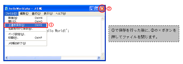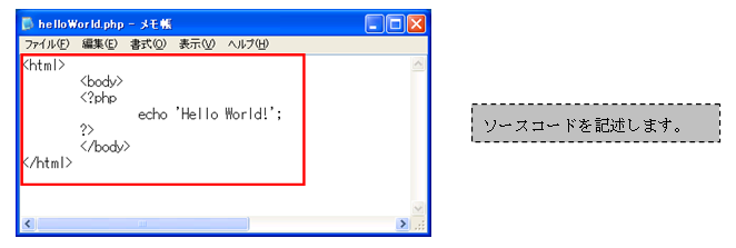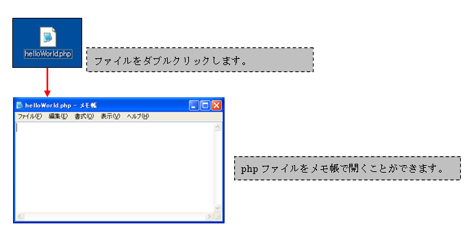 helloWorld.phpをダブルクリック すると、メモ帳でファイルが開きます。