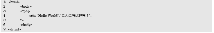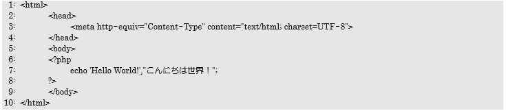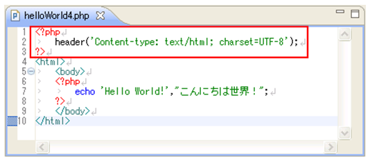 helloWorld2.phpと違い2~4行目に<head>~</head>のヘッドタグが記述され、その間の3行目に多目的タグである<meta>タグが記述されています。
