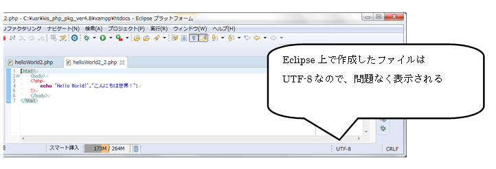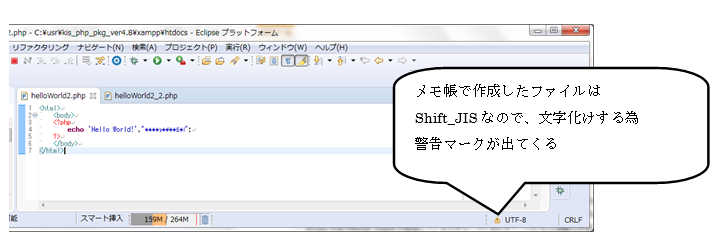 「helloWorld.php」では特に指定はしませんでしたが、日本語を扱う場合にはきちんと設定しておかないと、文字化けする問題が発生してしまいます。その他、メモ帳で作成したファイルをEclipseで開くと文字化けしますので合わせて覚えておいてください。