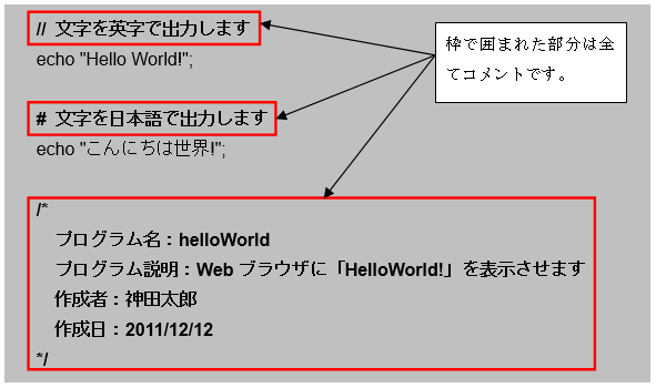コメント文とはPHPプログラムの中に書き込む注釈のことです。コメントは単なる説明文なので、プログラムの実行には影響はありません。
