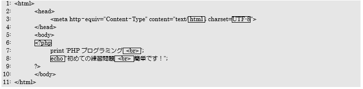 ⑤ e. echo :Webブラウザへ出力命令文を記述します。