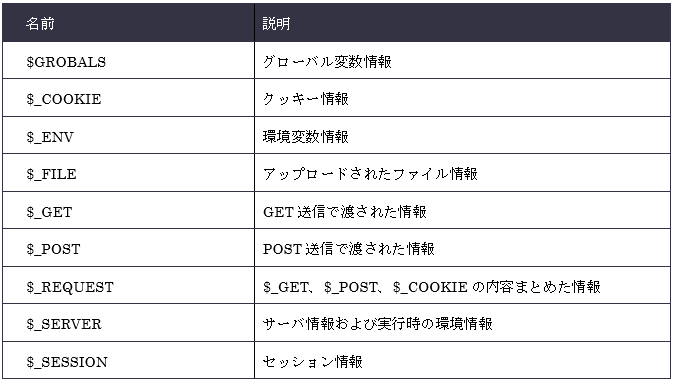 各データを集めてまとめた、主なスーパーグローバル変数を以下の表5.4.1に示します。