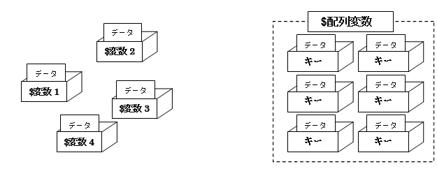 変数が「1つの箱を1つの名前で1つのデータ」しか扱えなかったのに対して、配列変数は「複数の箱を1つの名前で複数のデータ」を扱えます。