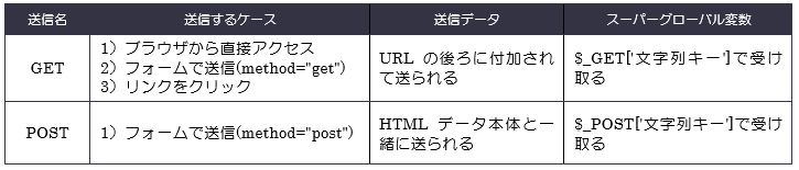 上記で示した通り、POST送信は<form>タグのmethod属性をpostに指定した場合にしか設定できません。GET送信はフォームもしくはリンクから指定した2つの場合にGET送信になります。この3つのパターンをしっかり覚えておけばPHPプログラミングでは問題ありません。