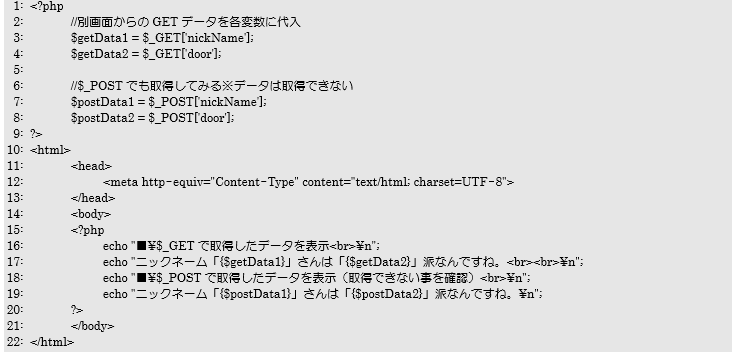 7、8行目は今回のプログラムではPOST送信でしかデータが送られてこないので、$_GETでは値が取得できないことを確認するための処理になっています。