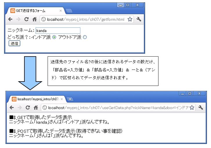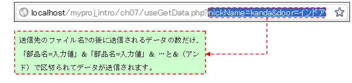 また入力データ送信後の画面のURLを確認すると、「localhost/myproj_intro/ch07/useGetData.php?」の後に「nickName=kanda&door=インドア」とフォームで入力したデータが追加されているのが分かります。これがPOST送信と違いGET送信でURLにデータをくっつけて送る仕組みになります。